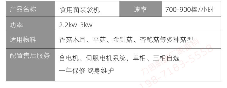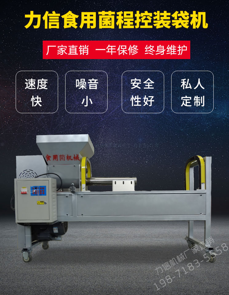 力信機械食用菌裝袋扎口一體機/自動裝扎一體機,一鍵操作,簡單方便。裝袋區(qū)采用電腦程控自動裝袋機,裝袋完成后直接送入扎口區(qū),自動進(jìn)行扎口作業(yè),扎口完成后由機械手送出,一體化操作,自動化程度高,將復(fù)雜的工序簡單化,省時又省力。